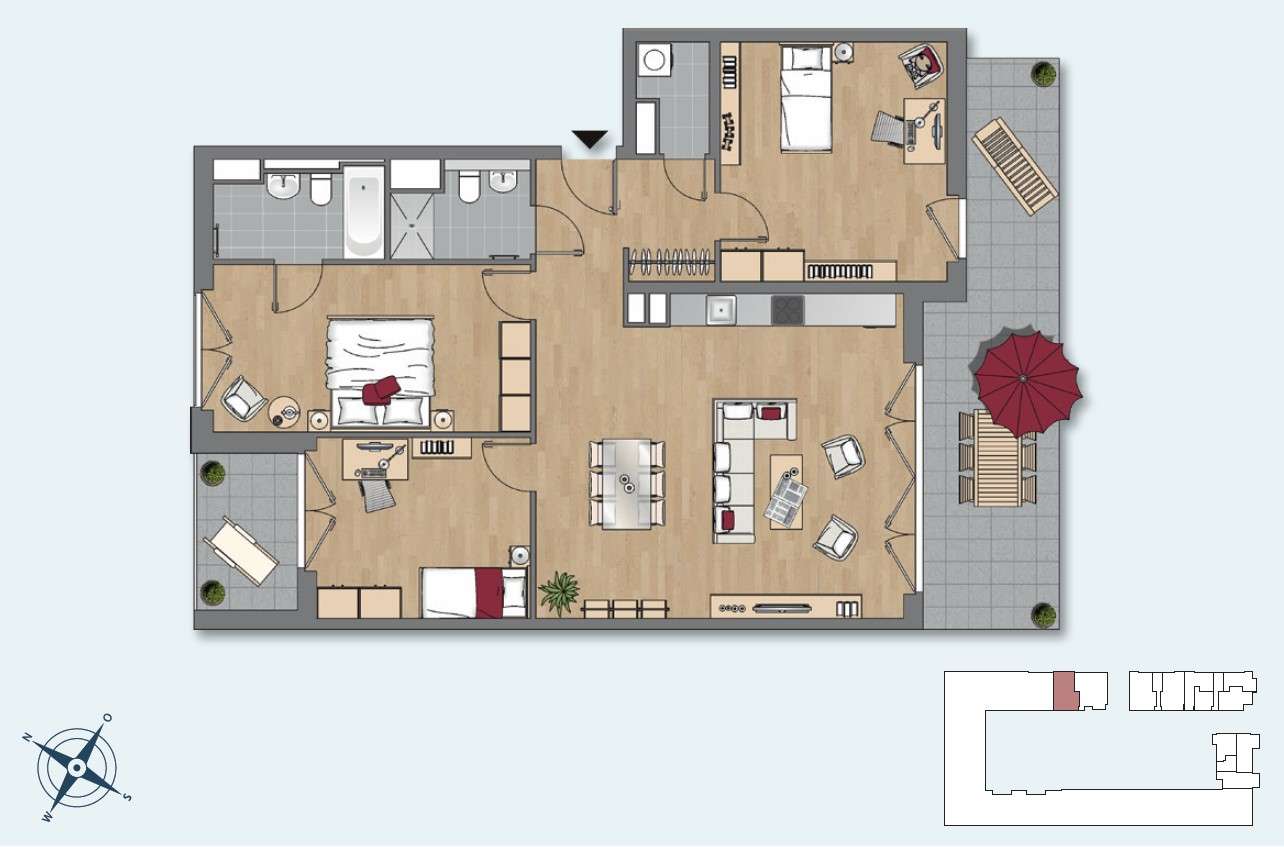 Schon vor dem Haus stehend beeindruckt das Gebäude mit einer schönen Klinkerfassade. Weitere Details des Neubaus ist die Tiefgarage, der Fahrradabstellraum sowie ein Aufzug, der Sie von der Tiefgarage bis ins Dachgeschoss bringt. Der geschützte und begrünte Innenhof mit einer ansprechenden Gartengestaltung rundest das Gesamtbild der Wohnanlage ab. Dort laden Sie Sitzplätze zum Verweilen ein und Kinder werden die Spielgeräte mögen. Die Wohnungen wurden hochwertig ausgestattet. Alle Wohnräume sind mit einem Eichenparkettboden versehen. Eine Fußbodenheizung in der gesamten Wohnung erwärmt nicht nur die Räume, auch im Winter werden Sie nie kalte Füße bekommen. Die Bäder wurden mit großen und modernen Fliesen ausgestattet. Durch teilweise fast raumhohe Fensterverglasungen sind helle und freundliche Räume entstanden. Die Küchenbereiche wurden ebenfalls teilweise in den offenen Wohn- und Essbereich integriert, abgerundet durch eine hochwertige Einbauküche. Die Balkone oder Terrassen bieten genügend Platz, um entspannt den Alltag bei einem Glas Wein ausklingen zu lassen. Zu jeder Wohnung gehört ebenfalls ein eigener geräumiger Kellerraum, der mit einer Steckdose sowie Licht ausgestattet ist.