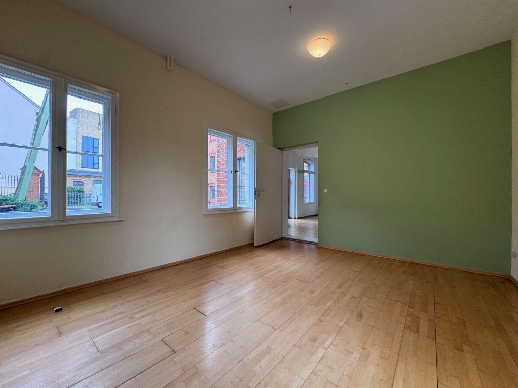 Die von uns angebotene Fläche liegt im denkmalgeschützten Gebäude der ehemaligen Dampfwäscherei aus dem Jahr 1904. Die Backsteinfassade mit den filigranen großflächigen Metallfenstern sowie weiteren zahlreichen Details wie dem Lastenkran lassen noch heute den ursprünglichen Nutzungszweck erkennen.